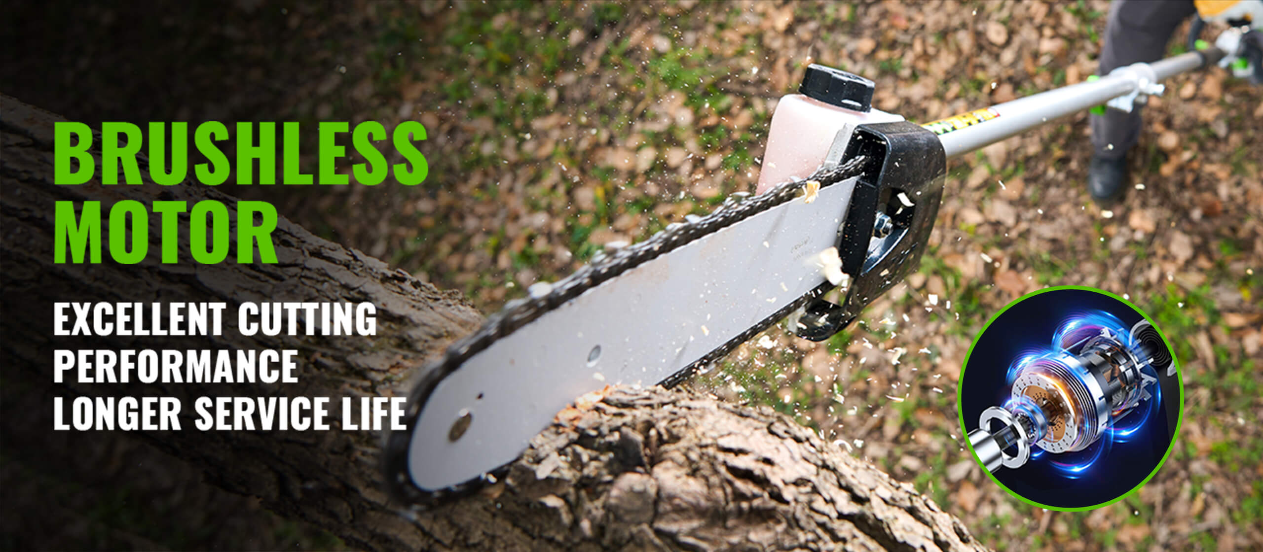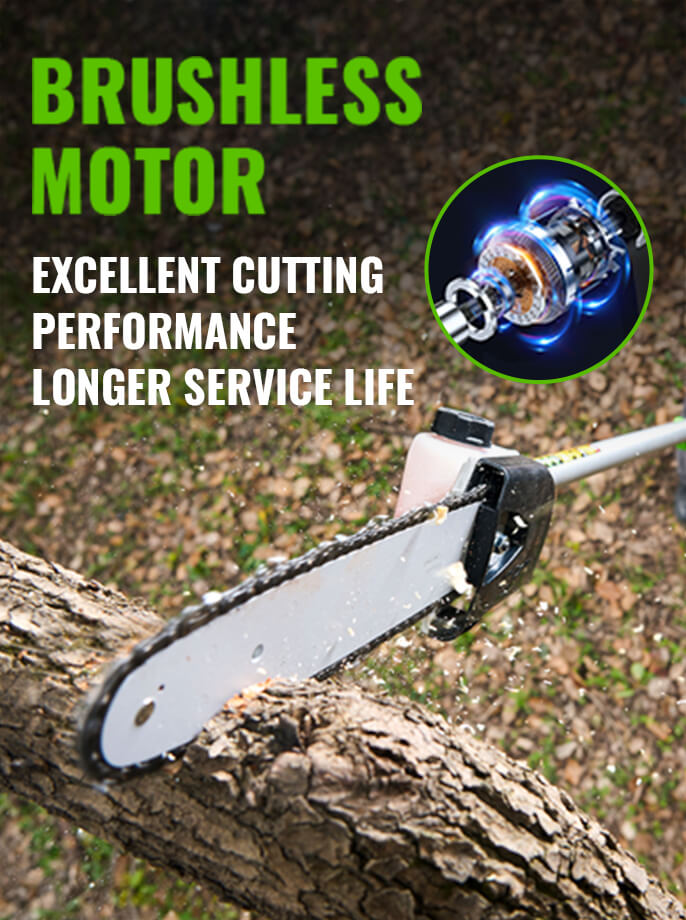 At the heart of the NovorikX 60V Cordless Pole Saw is a high-efficiency brushless motor that runs cooler, lasts longer, and delivers more torque than brushed alternatives. It reduces vibration and wear, helping you cut through dense branches cleanly and consistently while preserving battery life.