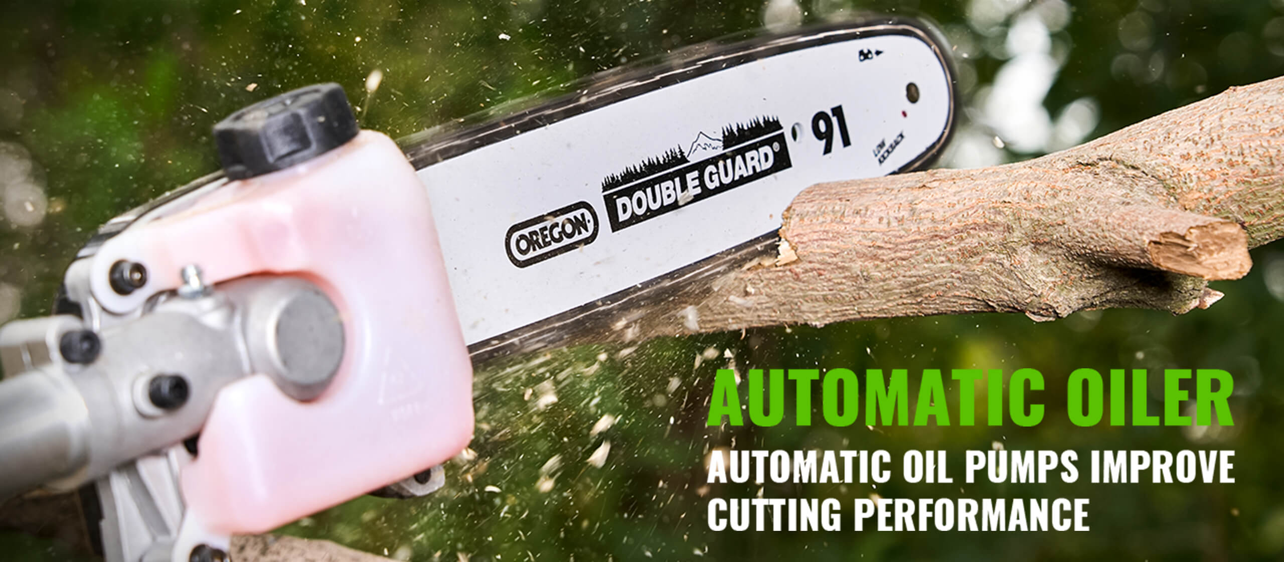 The NovorikX 60V Cordless Pole Saw features a built-in automatic oiler that keeps the 10-inch bar and chain continuously lubricated during use. By reducing friction and wear, it ensures smoother cutting performance, extends chain life, and minimizes maintenance—so you can stay focused on the job, not the upkeep.