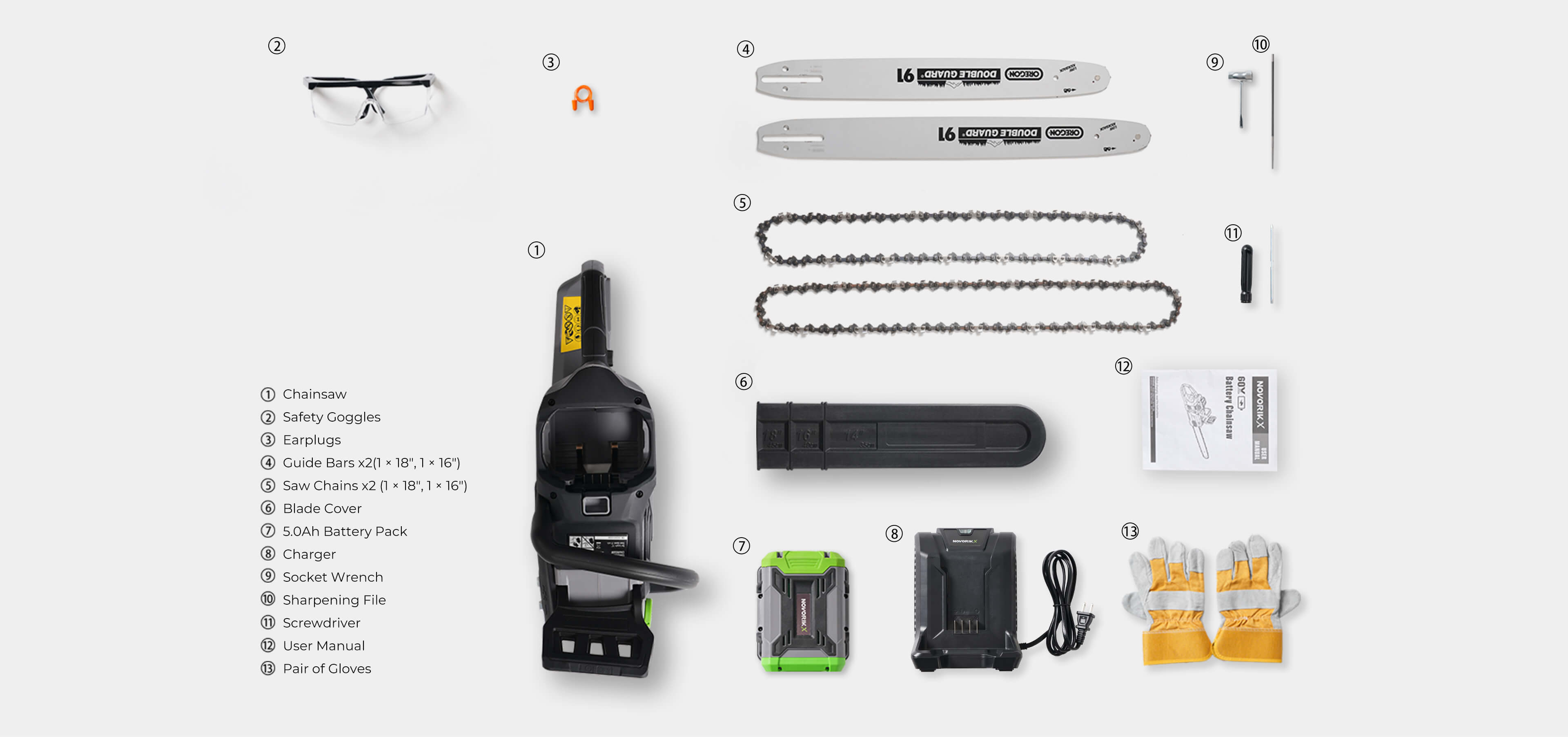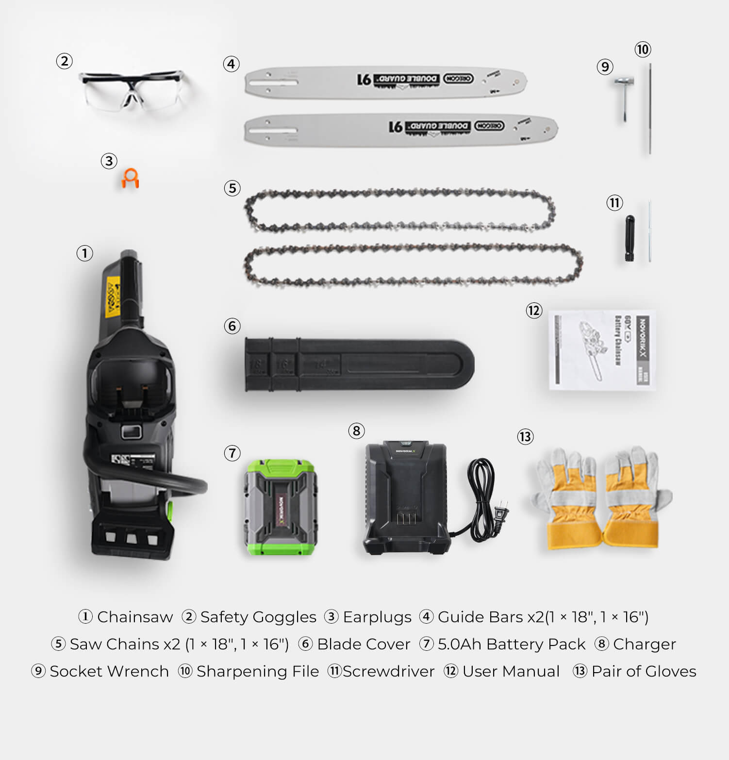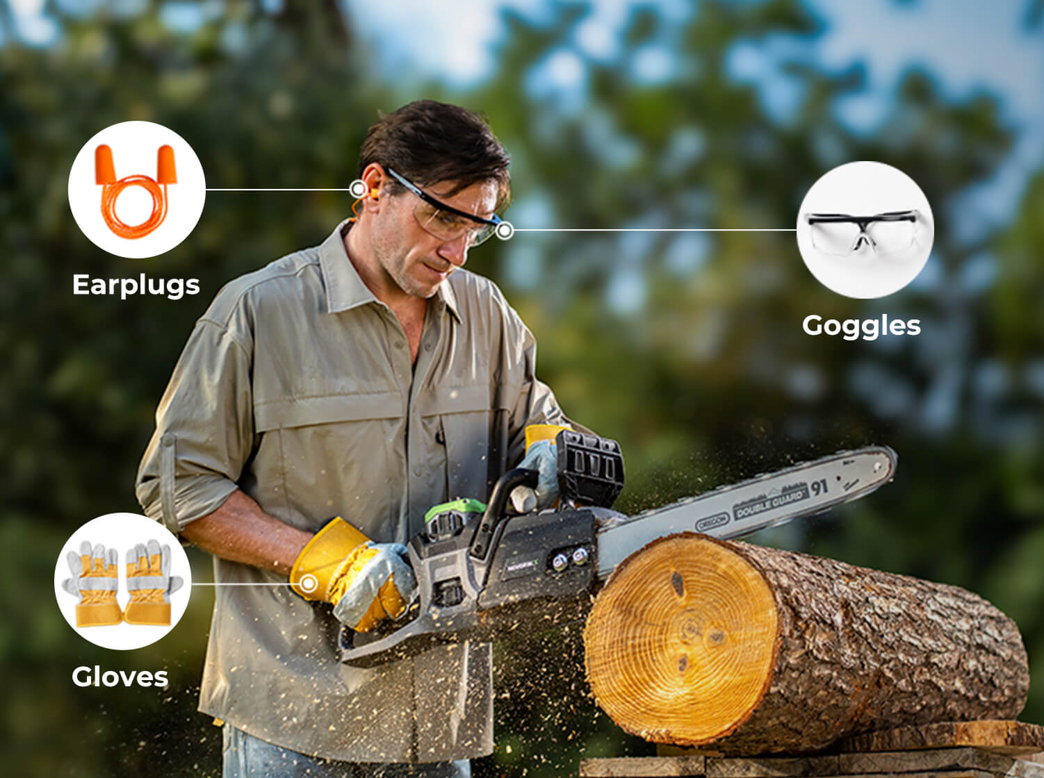 For complete protection, every NovorikX chainsaw comes with a full safety kit, including impact-resistant goggles, cut-resistant gloves, and noise-reducing earplugs—so you’re fully prepared for any job, from the first cut to the last.