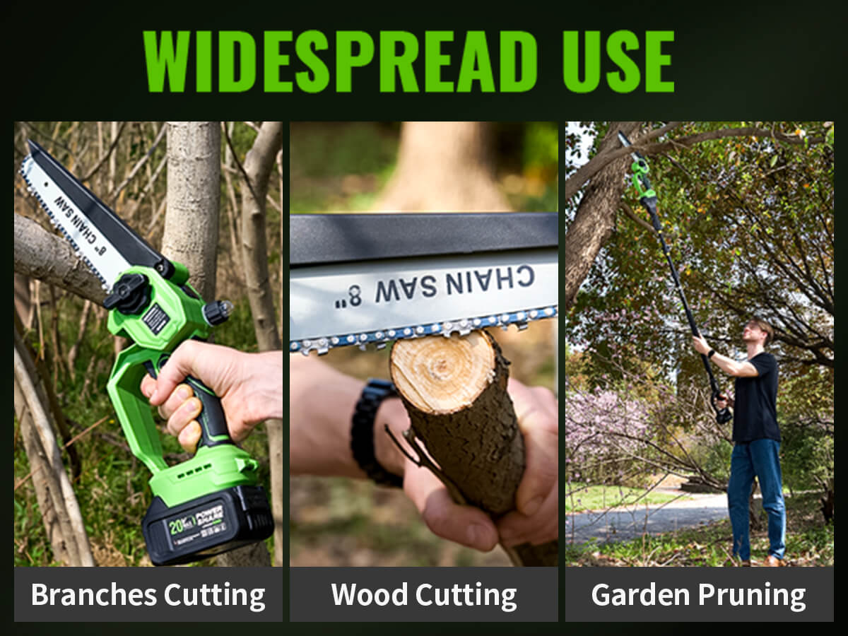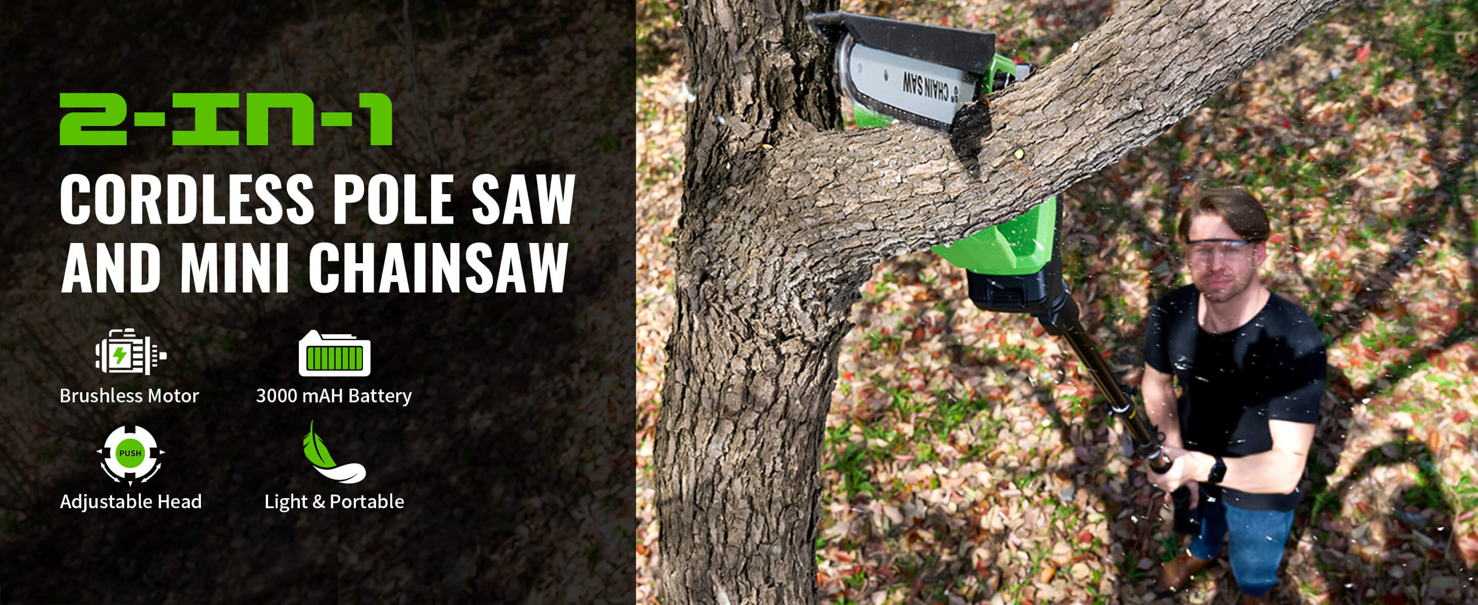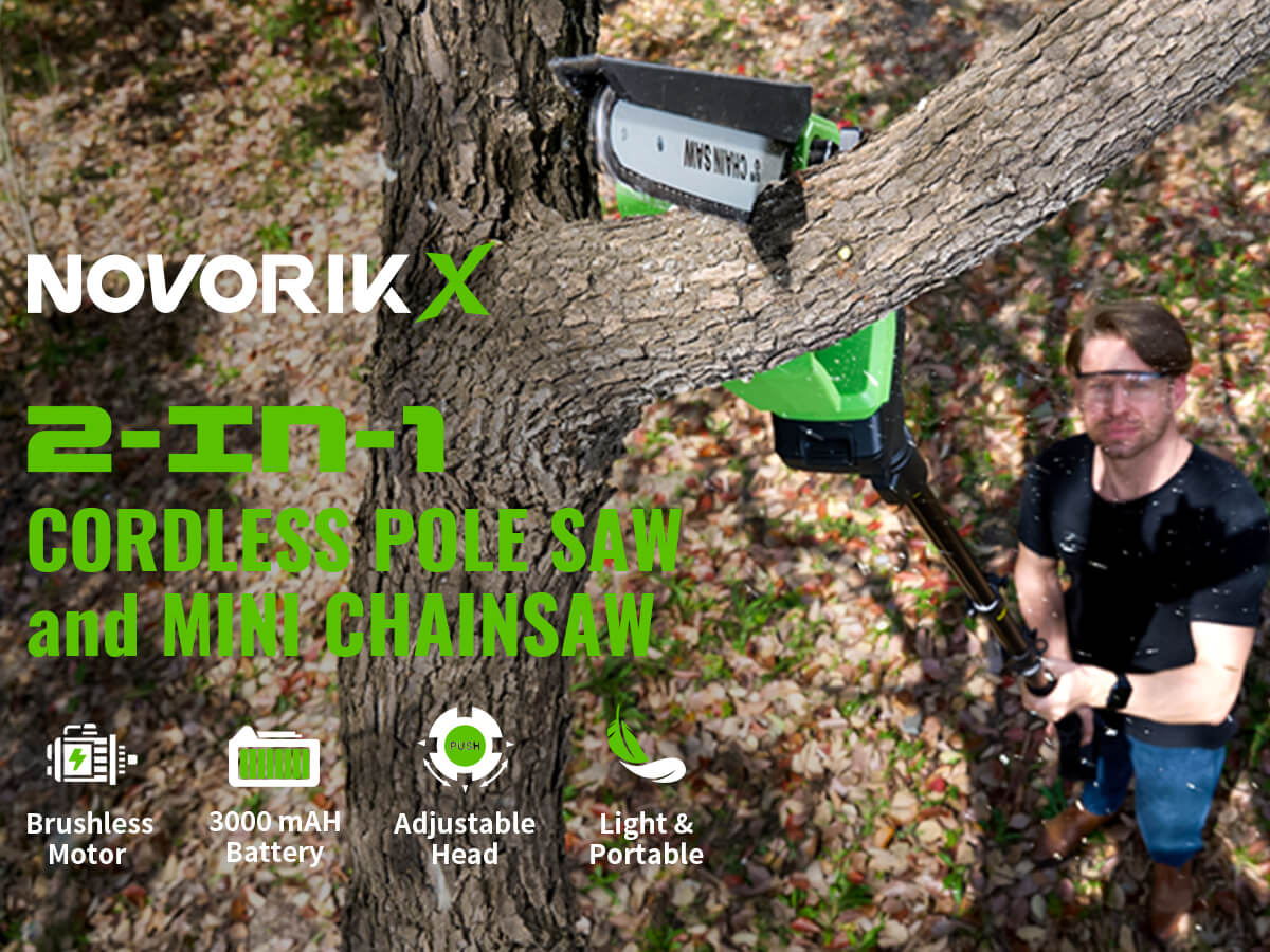 The NovorikX 2-in-1 Cordless Pole Saw and Mini Chain Saw gives you the versatility at your fingertips to handle a variety of cutting tasks. Extend the pole up to 15 feet when trimming high branches, then detach the pole and instantly switch to handheld mode for ground sawing. Featuring a high-efficiency brushless motor and a durable 3000mAh battery, it's lightweight, easy to maneuver, and delivers consistent performance. The adjustable blade ensures the right angle for every job.