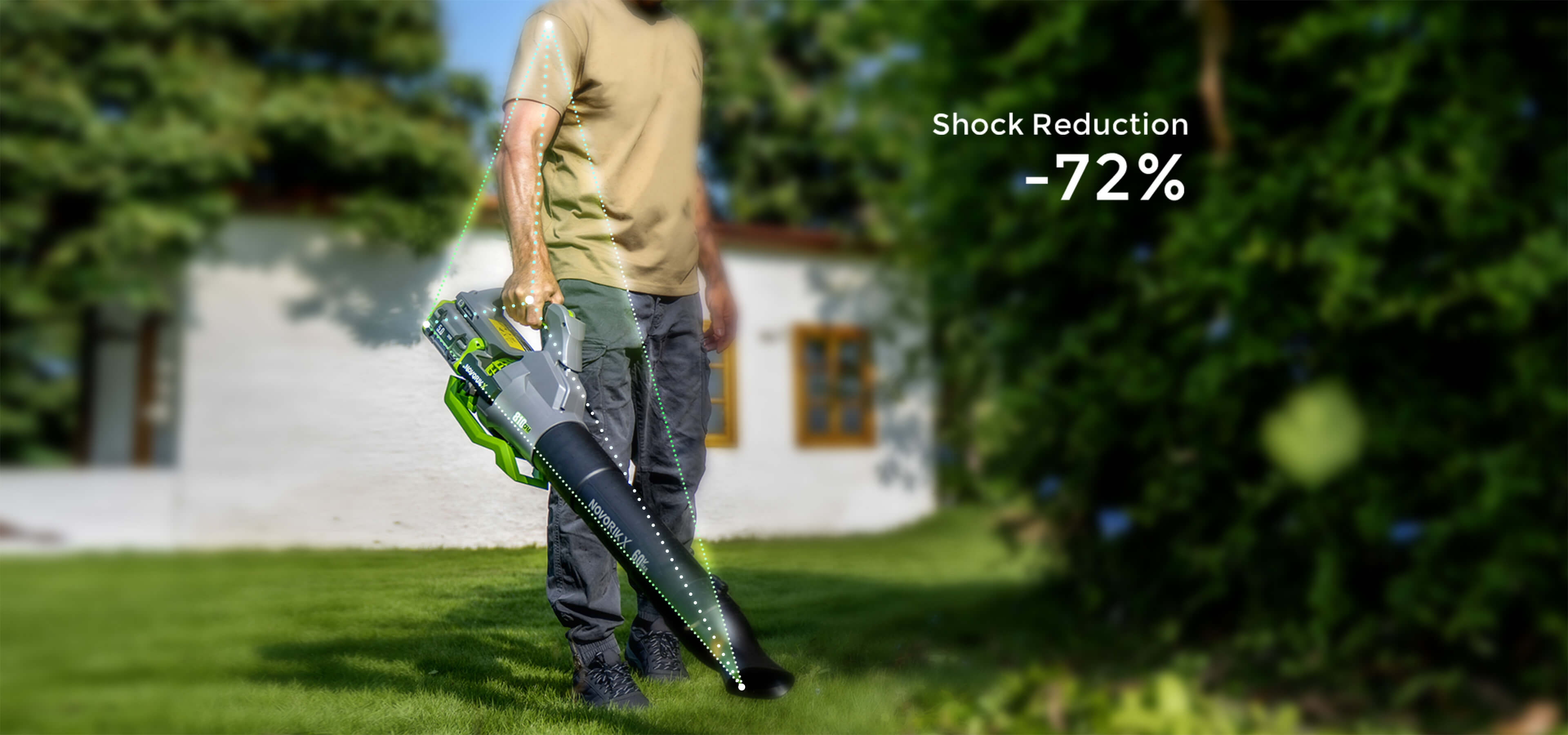 Designed for professional-grade comfort, the blower features a vibration-dampening rubberized grip, balanced weight distribution, and an angled handle to reduce wrist strain. Work longer and more precisely—with 72% less shock and fatigue-free control.